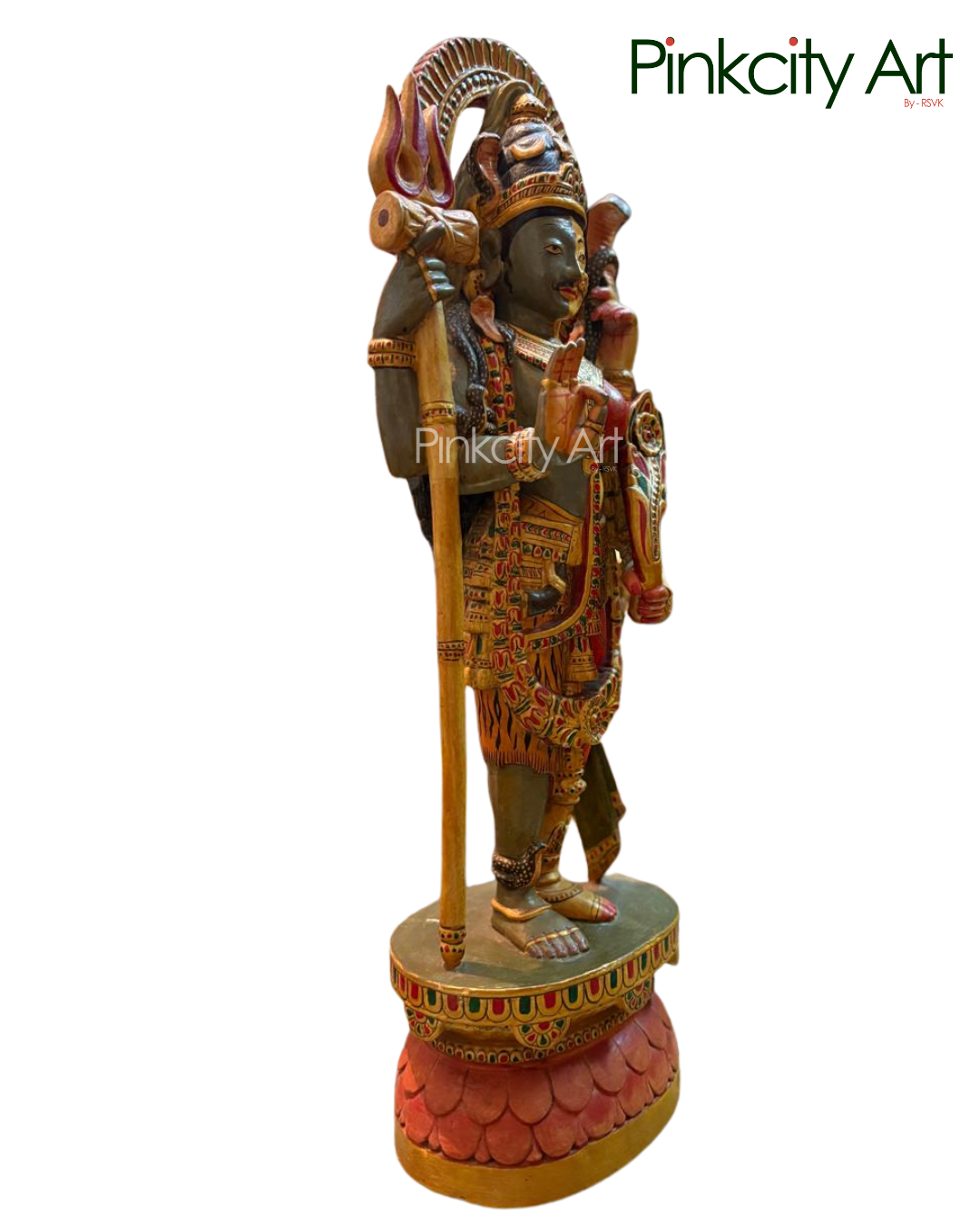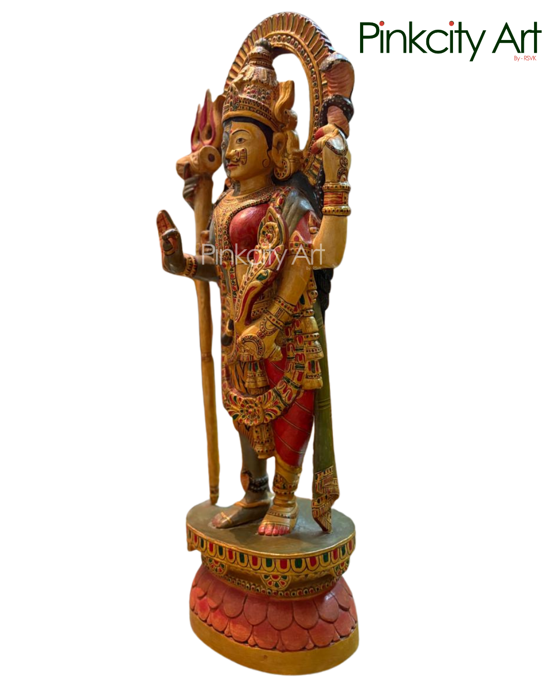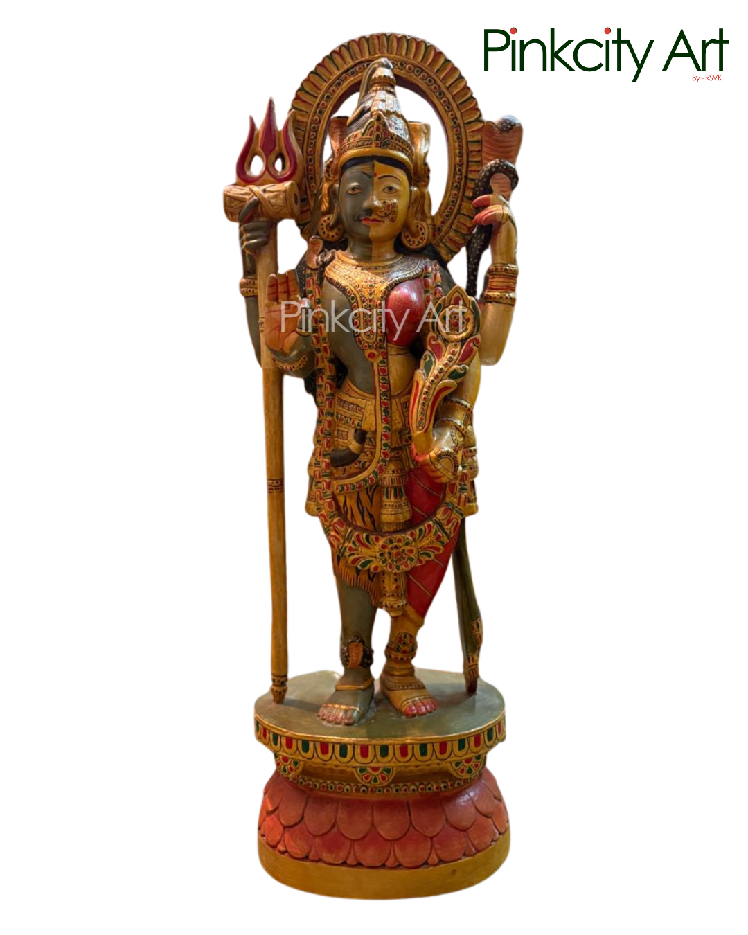 This exquisite Ardhanarishwar sculpture embodies the perfect union of Lord Shiva and Goddess Parvati, symbolizing balance, harmony, and divine completeness. Meticulously handcrafted from premium teak wood, it showcases graceful detailing and a rich, refined finish that reflects superior craftsmanship. Ideal for temples, sacred spaces, and discerning interiors, this creation stands as a timeless expression of devotion, artistry, and spiritual elegance.
