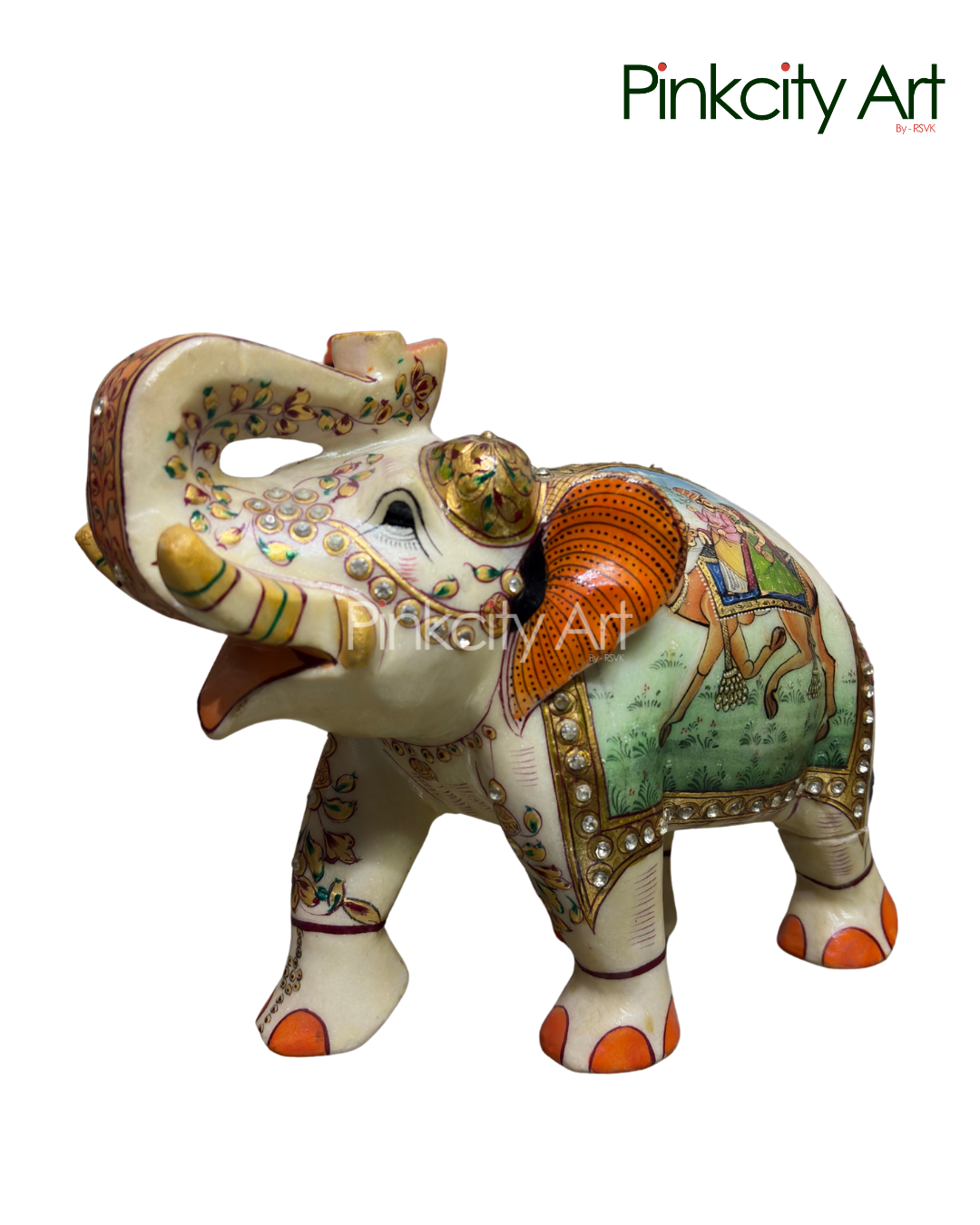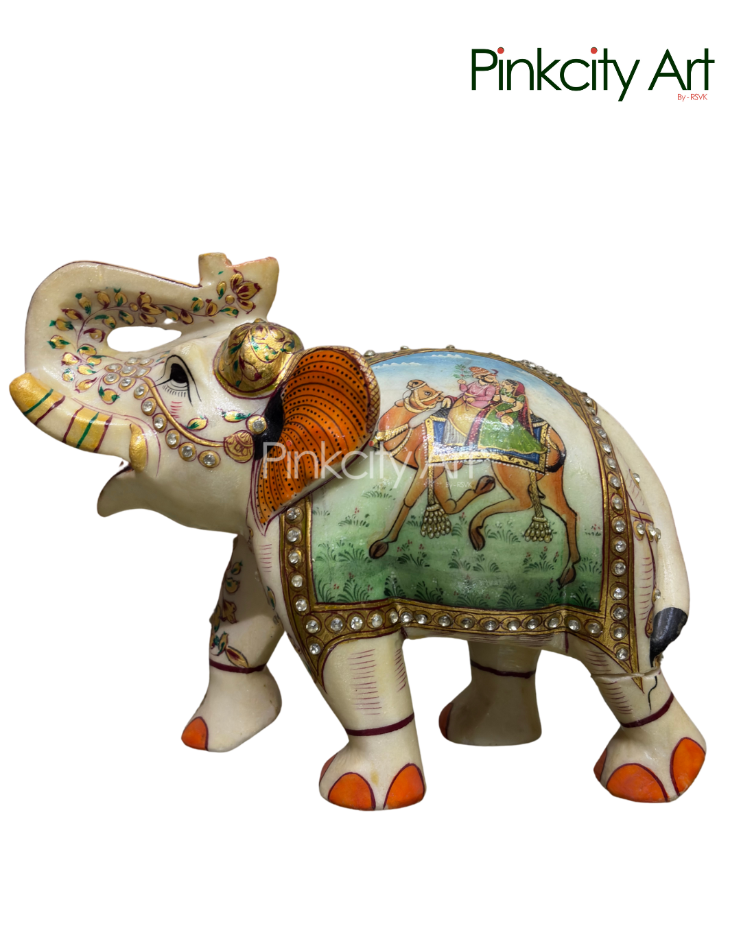This hand-painted marble elephant sculpture features a beautifully detailed camel motif painted across its body, enhanced with delicate mirror work that adds depth and visual richness. Crafted from high-quality marble, the piece reflects traditional Indian artistry, where vibrant colors, fine brushwork, and reflective accents come together in perfect harmony. Ideal for refined interiors, cultural spaces, and art collections, this creation celebrates heritage craftsmanship with a touch of elegance and uniqueness.