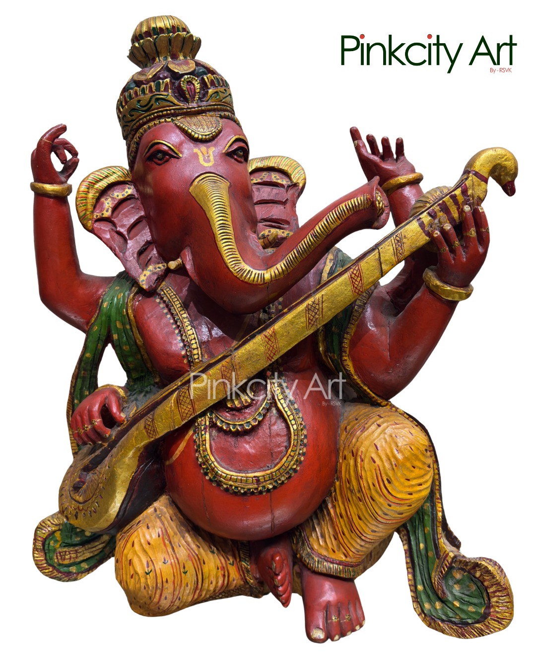 This beautifully crafted Lord Ganesha sculpture depicts the deity gracefully playing the veena, symbolizing wisdom, harmony, and the divine connection with music and art. Handcrafted from solid teak wood, the sculpture showcases fine carving and balanced proportions. Each detail is hand painted with care, enhancing the expressions, ornaments, and overall elegance of the form. Ideal for temples, prayer spaces, and premium interiors, this creation reflects devotion, traditional craftsmanship, and timeless spiritual beauty
