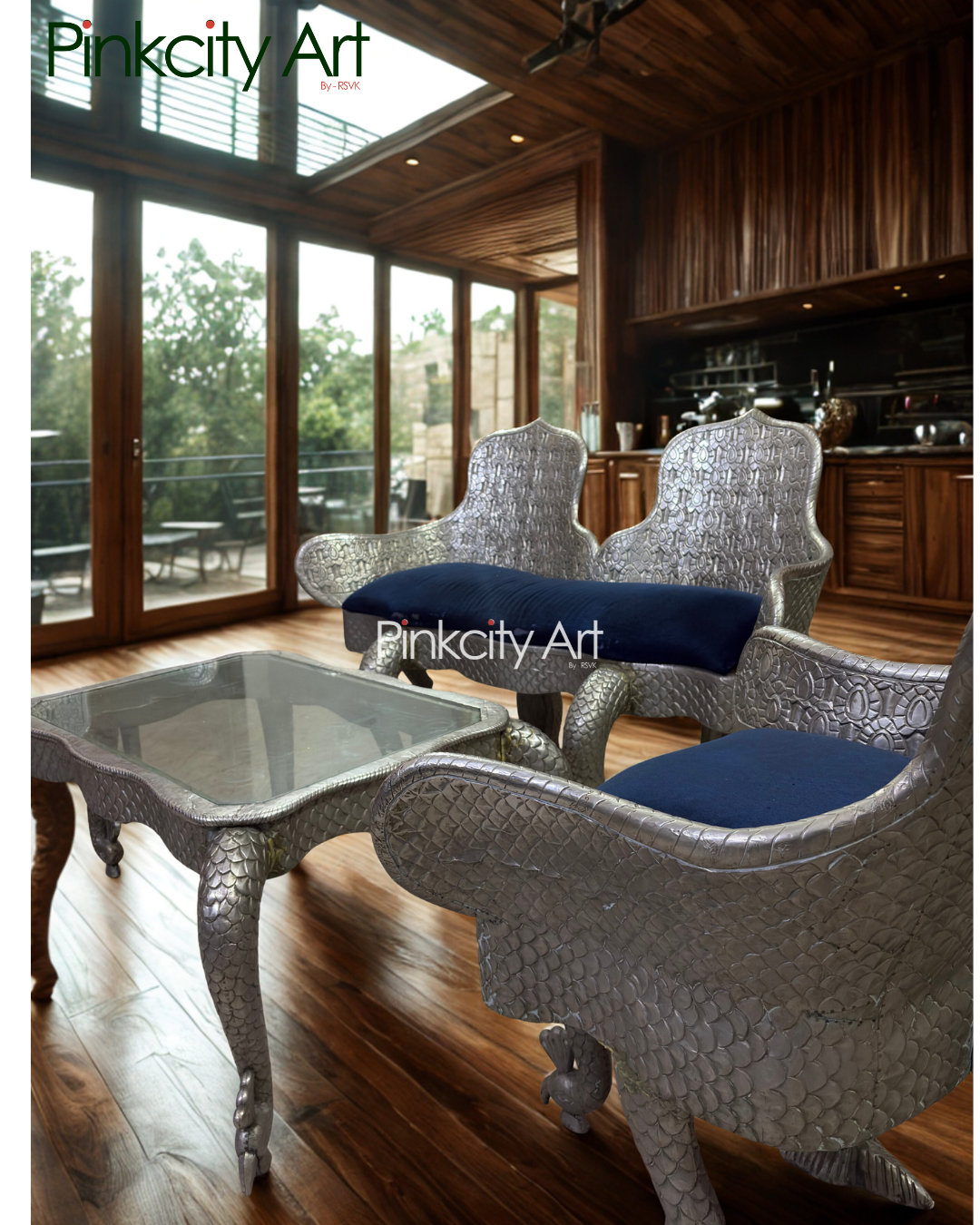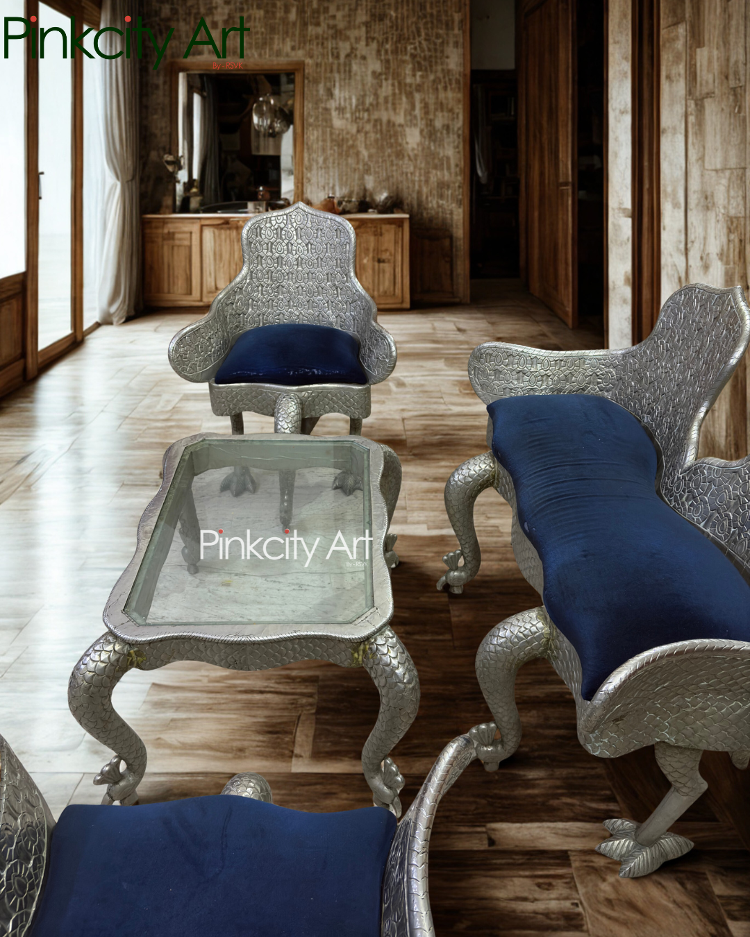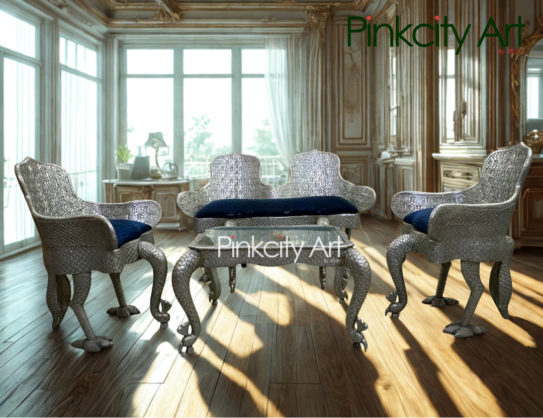This luxurious sofa set with a matching center table is masterfully crafted from solid wood and richly plated with German silver, creating a striking blend of strength and elegance. Designed around an exquisite peacock theme, every element reflects artistic harmony—from the gracefully sculpted legs of the chairs and table to the beautifully detailed backrests inspired by peacock feathers. The fine silver plating enhances the intricate carvings, giving the set a royal, timeless appeal. Perfect for heritage interiors, luxury living rooms, and statement spaces, this ensemble is a true celebration of Indian craftsmanship and refined design.