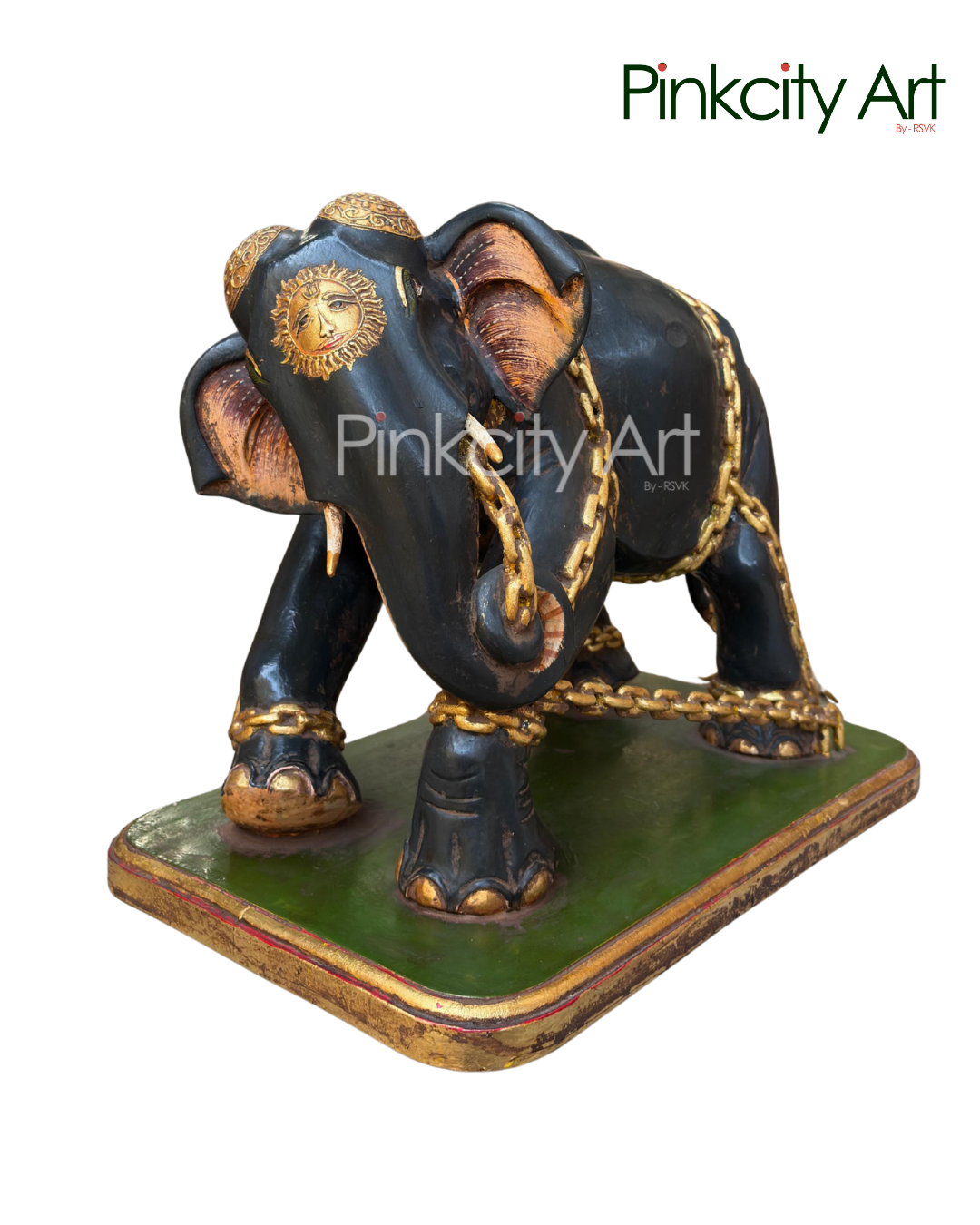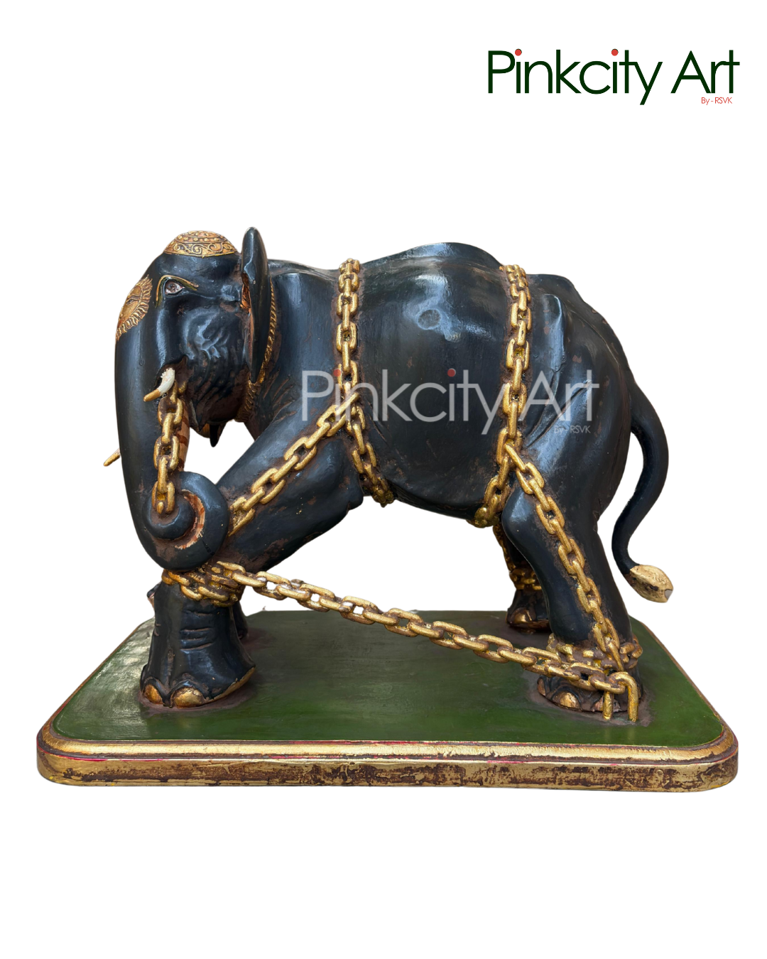 This striking wooden elephant sculpture is handcrafted from quality wood and finished with detailed hand painting. The majestic form is enhanced with golden-colored chains, symbolizing strength, royalty, and tradition. Intricate detailing on the body and accessories reflects skilled artistry and cultural elegance. Perfect for premium interiors, heritage décor, and statement displays, this piece brings power, grace, and timeless charm into any space.